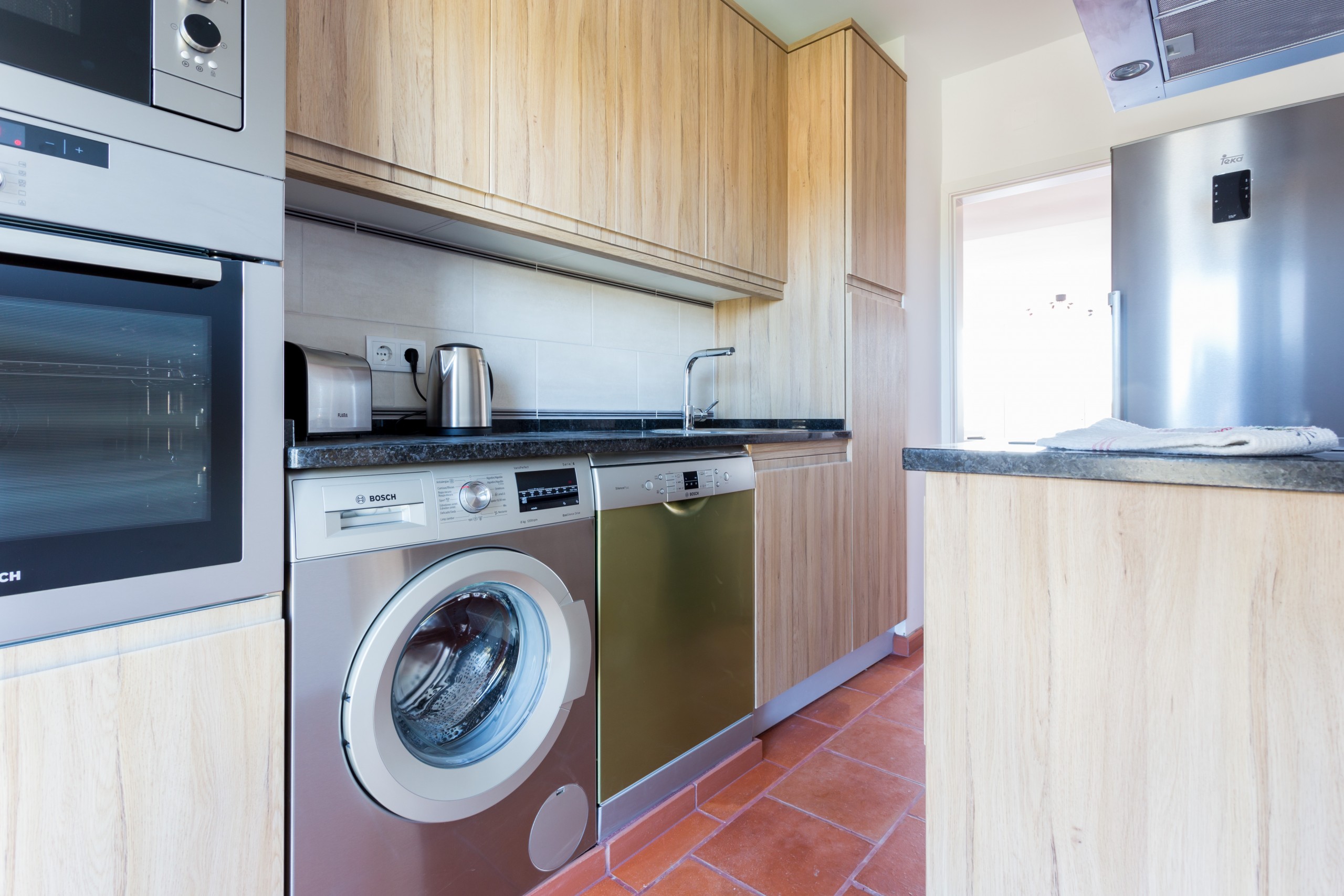 Die separate Küche mit Ceranfeld ist ausgestattet in einen Kühlschrank, eine Mikrowelle, ein Backofen, einen Gefrierschrank, eine Waschmaschine, eine Spülmaschine, Geschirr/Besteck, Kochutensilien, eine Kaffeemaschine, einen Toaster und einen Wasserkocher.